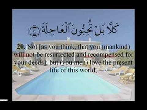 Nay, I swear by the Day of Resurrection; (1) Nay, I swear by the accusing soul (that this Scripture is true). (2) Thinketh man that We shall not assemble his bones? (3) Yea, verily Yea. We are Able to restore his very fingers! (4) But man would fain deny what is before him. (5) He asketh: When will be this Day of Resurrection? (6) But when sight is confounded (7) And the moon is eclipsed (8) And sun and moon are united, (9) On that day man will cry: Whither to flee! (10) Alas! No refuge! (11) Unto thy Lord is the recourse that day. (12) On that day man is told the tale of that which he hath sent before and left behind. (13) Oh, but man is a telling witness against himself, (14) Although he tender his excuses. (15) Stir not thy tongue herewith to hasten it. (16) Lo! upon Us (resteth) the putting together thereof and the reading thereof. (17) And when We read it, follow thou the reading; (18) Then lo! upon Us (resteth) the explanation thereof. (19) Nay, but ye do love the fleeting Now (20) And neglect the Hereafter. (21) That day will faces be resplendent, (22) Looking toward their Lord; (23) And that day will other faces be despondent, (24) Thou wilt know that some great disaster is about to fall on them. (25) Nay, but when the life cometh up to the throat (26) And it is said: Where is the wizard (who can save him now)? (27) And he knoweth that it is the parting; (28) And agony is heaped on agony; (29) Unto thy Lord that day will be the driving. (30) For he neither trusted, nor prayed. (31) But he denied and flouted. (32) Then went he to his folk with glee. (33) Nearer unto thee and nearer, (34) Again nearer unto thee and nearer (is the doom). (35) Thinketh man that he is to be left aimless? (36)Was he not a drop of fluid which gushed forth? (37)Then he became a clot; then (Allah) shaped and fashioned (38) And made of him a pair, the male and female. (39) Is not He (Who doeth so) able to bring the dead to life? (40)سُوۡرَةُ القِیَامَة